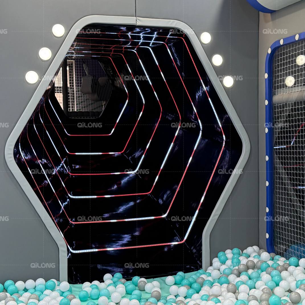 يؤدي نفق LED سداسي الشكل (مبطن بشرائط ضوء حمراء وبيضاء) إلى حفرة كرات مليئة بالكرات ذات الألوان الباستيل، مما يشجع الأطفال على "استكشاف الكواكب الغريبة".